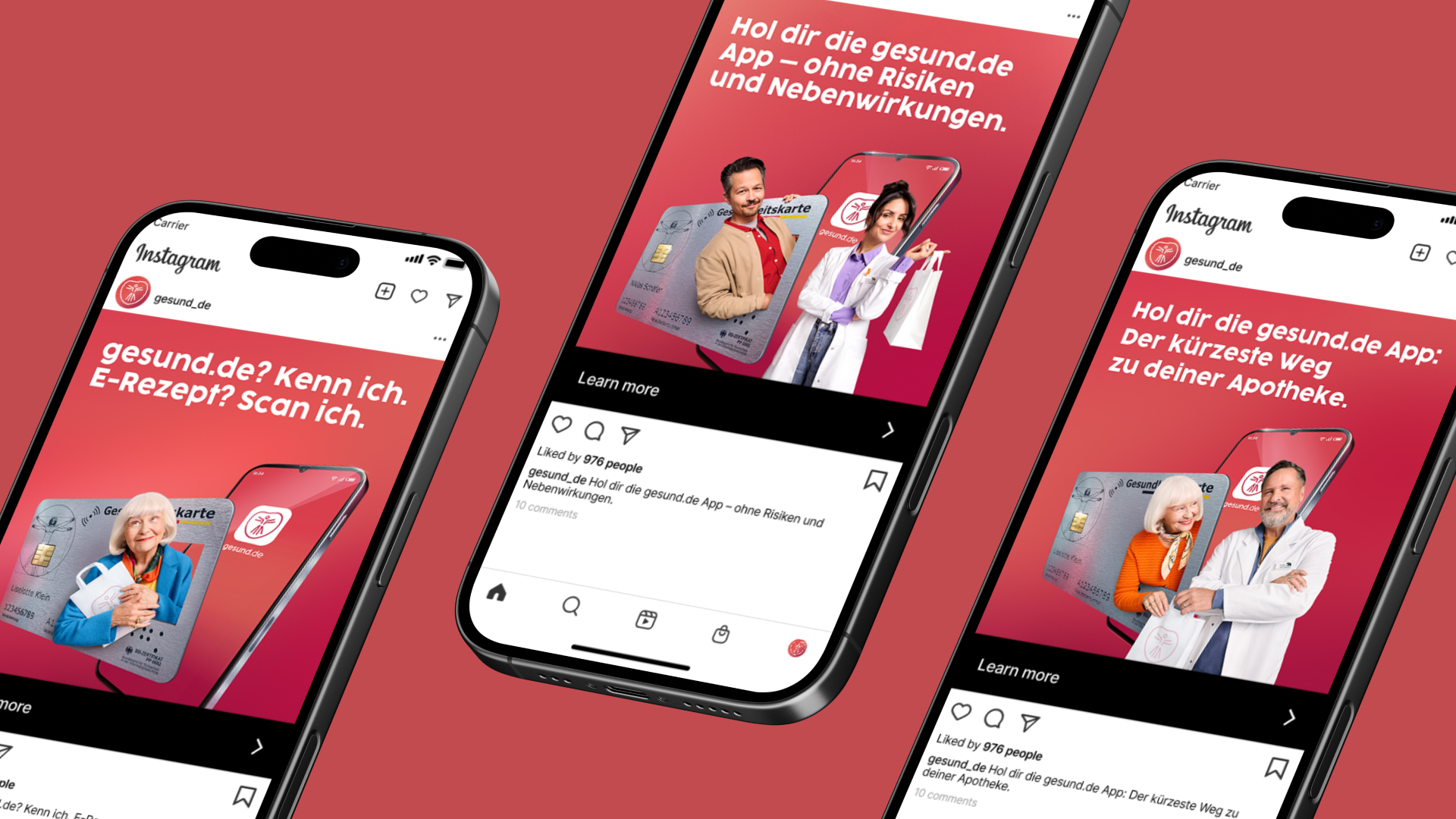 - Brand-Storytelling (Awareness): High-End Visuals, die gesund.de als verlässlichen Begleiter positionieren („E-Rezept? Scan ich.“).